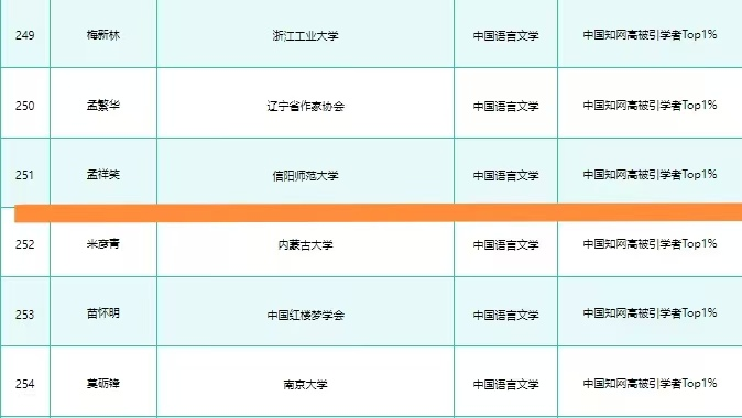 中国语言文学高被引学者名单(部分截图)