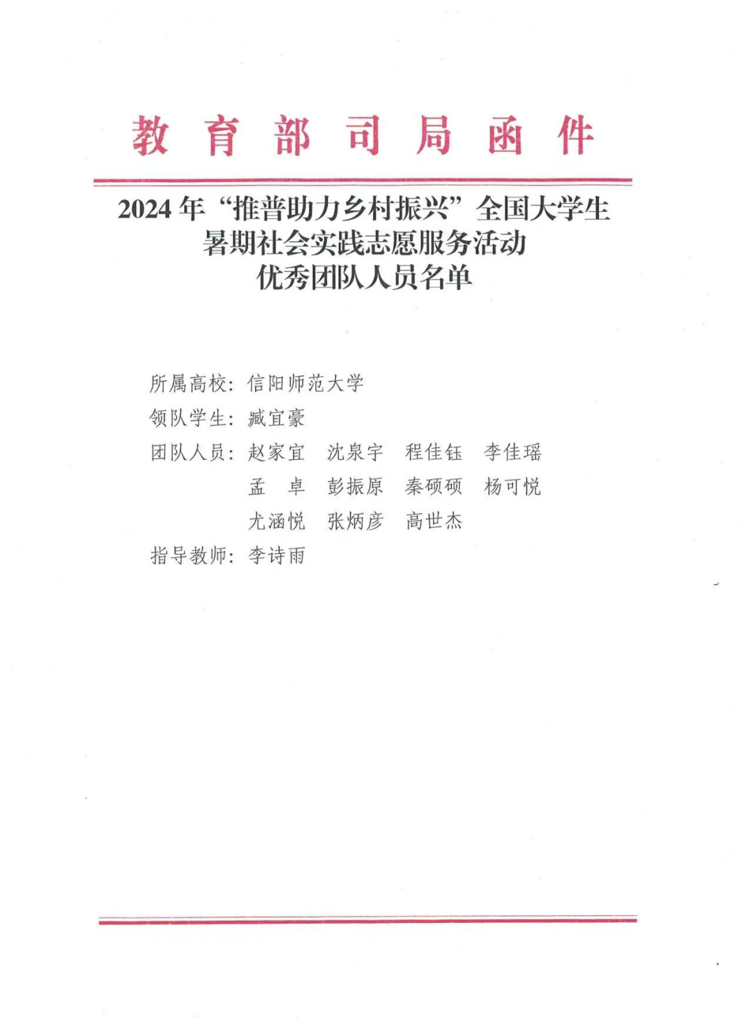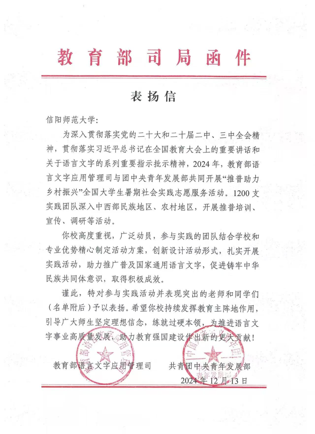 日前,教育部语言文字应用管理司和共青团中央青年发展部向信阳师范大学发来表扬信,表扬我校太阳集团tyc4633李诗雨老师指导的2024年“推普助力乡村振兴”全国大学生暑期社会实践志愿服务团队的突出工作表现,肯定我校在推广普及国家通用语言文字方面做出积极贡献。