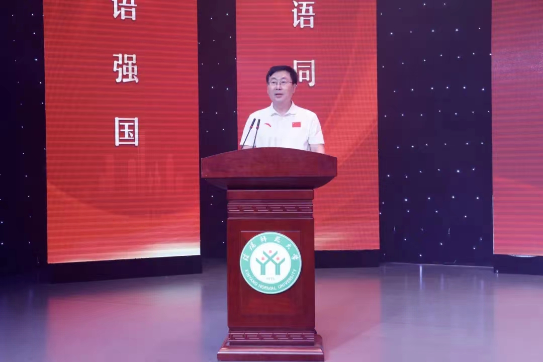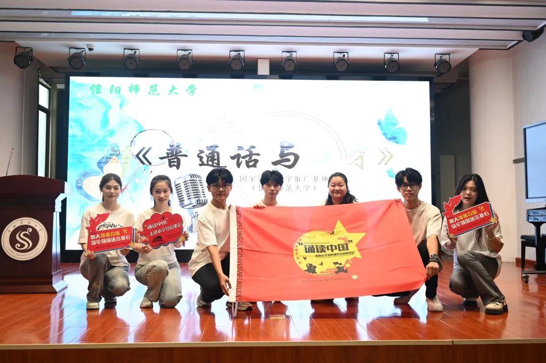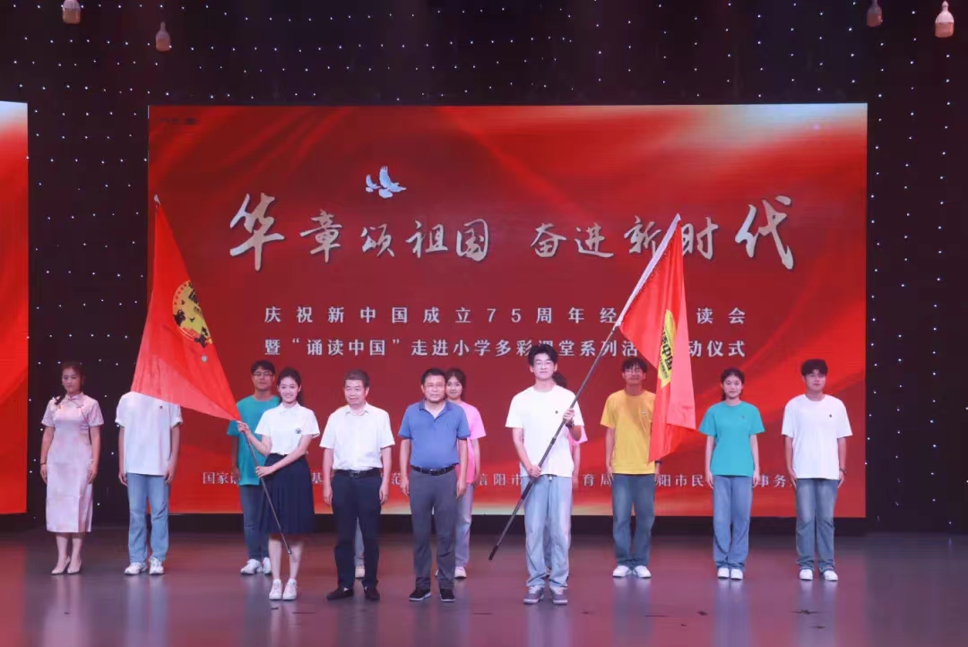 9月19日晚,在信阳师范大学演播厅举办“华章颂祖国 奋进新时代”庆祝新中国成立75周年经典诵读会暨“诵读中国”走进小学多彩课堂系列活动启动仪式。信阳师范大学副校长、国家语言文字推广基地副主任王娟,信阳市教育体育局副局长高君行等出席活动并致辞,勉励师生们深刻认识推普工作的重要意义,努力加大推普力度,为筑牢强国语言基石奉献力量。随后,信阳师范大学教务处处长、语委办主任李宝峰与信阳市教育教学研究室主任冯伟共同为“诵读中国”推普志愿服务队授旗。