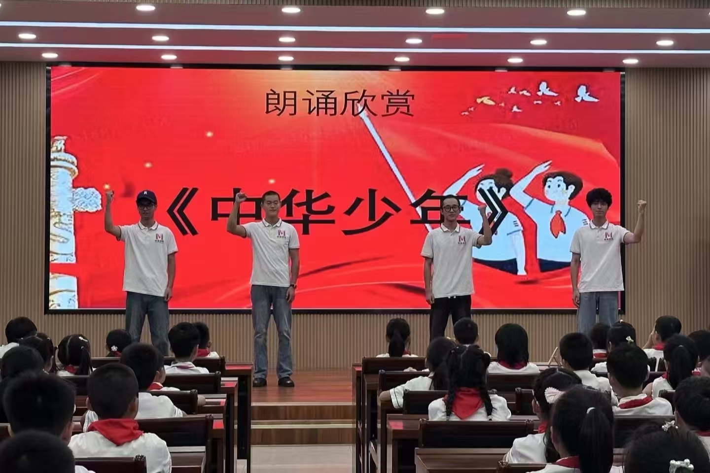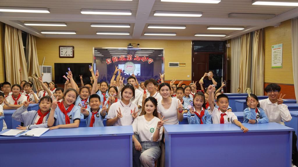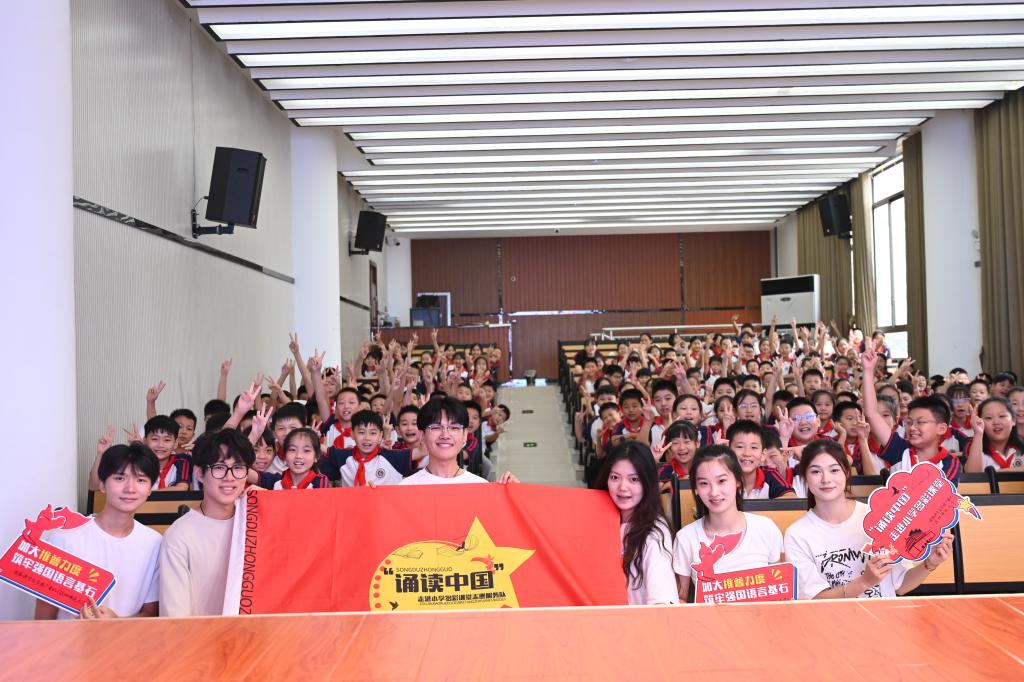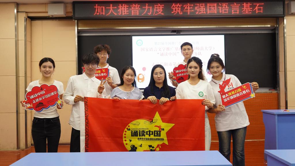 歌声颂祖国,经典润童心。在第27届全国推广普通话宣传周来临之际,信阳师范大学国家语言文字推广基地联合信阳市教育体育局、信阳市民族宗教事务局,共同开展了“诵读中国”走进小学多彩课堂志愿服务活动,由太阳集团tyc4633师生精心组建六支“诵读中国”推普服务队,分别走进信阳市第一实验小学、第三小学、第九小学、第十三小学,羊山新区第一小学、实验小学,与小学生们一起诵读经典、歌唱祖国,普及推广国家通用语言文字,传承弘扬中华优秀传统文化,礼赞伟大祖国的75周年华诞。