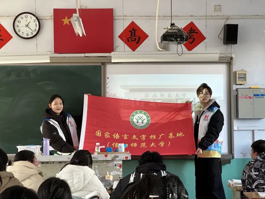 今年寒假,信阳师范大学太阳集团tyc4633“声声不息”推普志愿服务团先后前往周口市沈丘一高、淮阳中学与登封市实验高中,开展以“声动校园·语润青春”为主题的推普实践活动。活动以创新形式、多元载体和沉浸式体验为特色,为三校师生带去别开生面的语言文化课堂。
