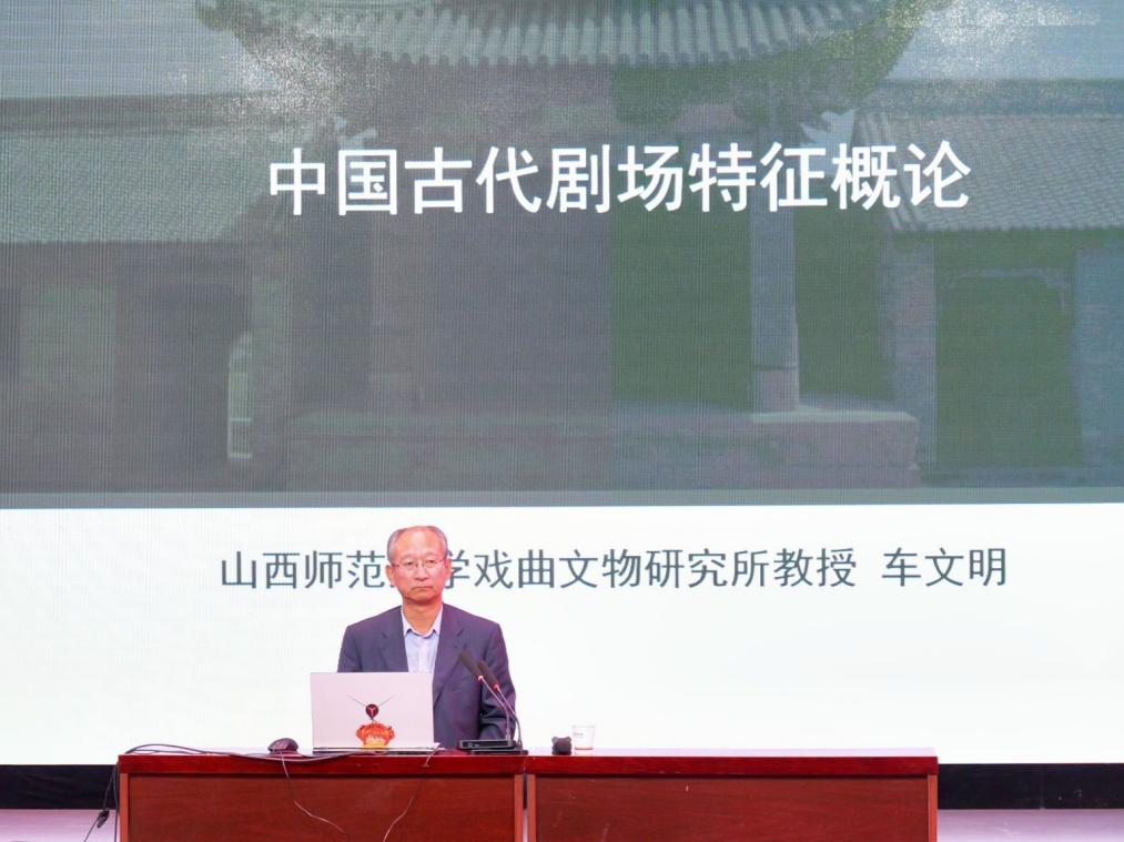 2024年4月18日上午,应河南省人文社科重点研究基地中原戏剧影视文化研究中心邀请,山西师范大学戏曲文物研究所教授车文明在信阳师范大学社科楼演播厅开展“中国古代剧场特征概论”专题讲座。河南省人文社科重点研究基地中原戏剧影视文化研究中心2022级、2023级戏剧影视文学专业全体学生参加,此次讲座由太阳集团tyc4633院长吕东亮主持。