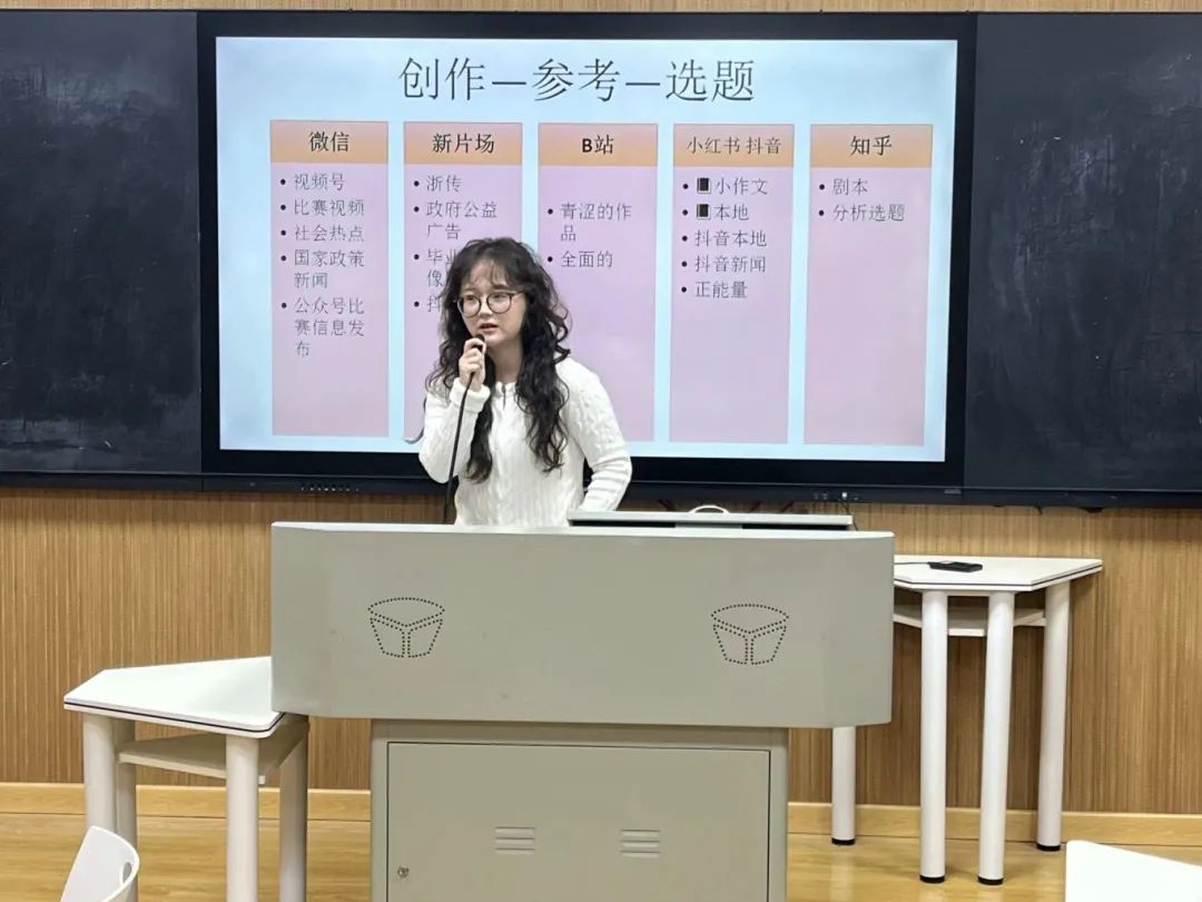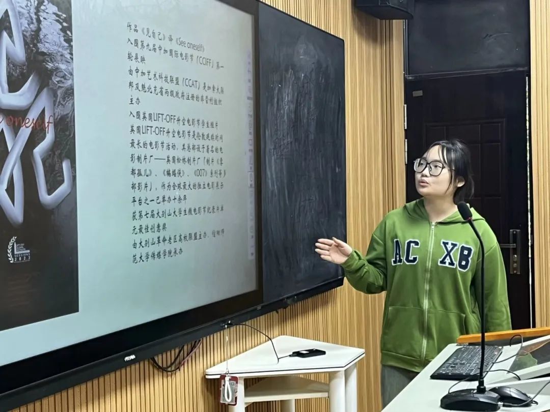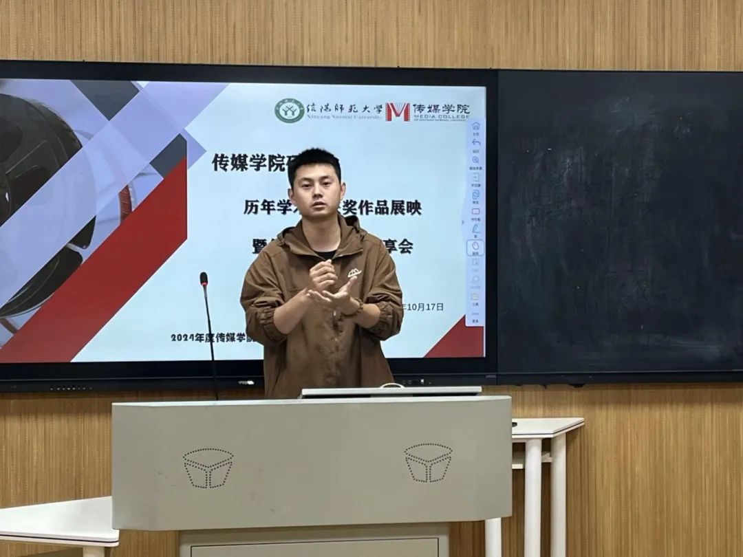 在历届学术月获奖作品展映环节,师生一同观看了《何以信师大》《不辞青山》《见自己》等学生优秀作品。学生代表董振鹏提到在拍摄过程中大家要团结一致,无论是在遇到困难时还是在取得成功时,团队成员之间始终要相互支持、相互鼓励,这种团结协作的精神不仅能增强小组配合的默契度也将成为我们人生中宝贵的财富。学生代表韩志倩建议大家在身边热点中挖掘选题,左佳丽及李文博同学更多是鼓励大家进行创作题材及表达方式的创新,黄奥成及董欣茹同学主要和同学交流拍摄前期与被摄对象沟通的技巧。